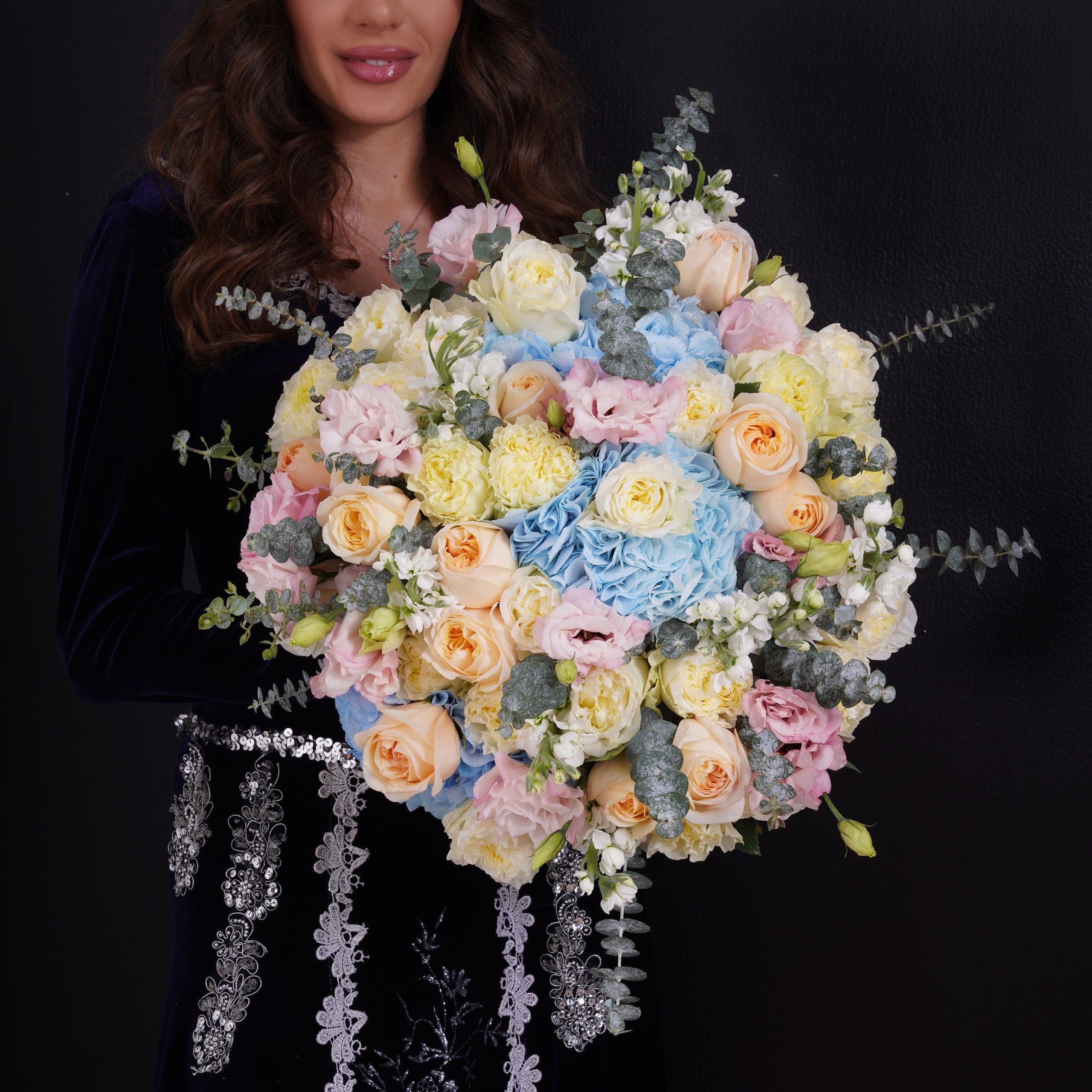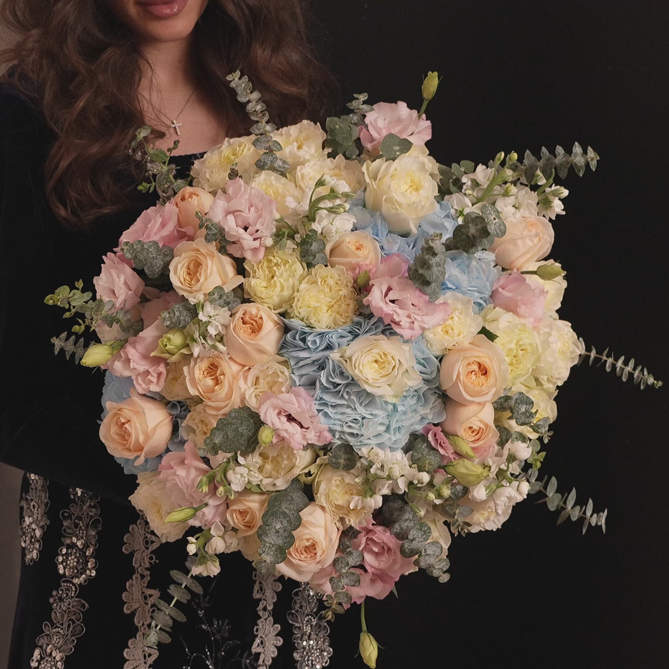 Anahit embodies serene feminine perfection. Soft blue hydrangea, cream roses, peach garden roses, and blush lisianthus blend into a cloud-like bouquet that feels pure, gentle, and ethereal. Every stem is placed with intention, creating a harmonious pastel palette that reflects the grace and elegance of Armenia’s most revered goddess.