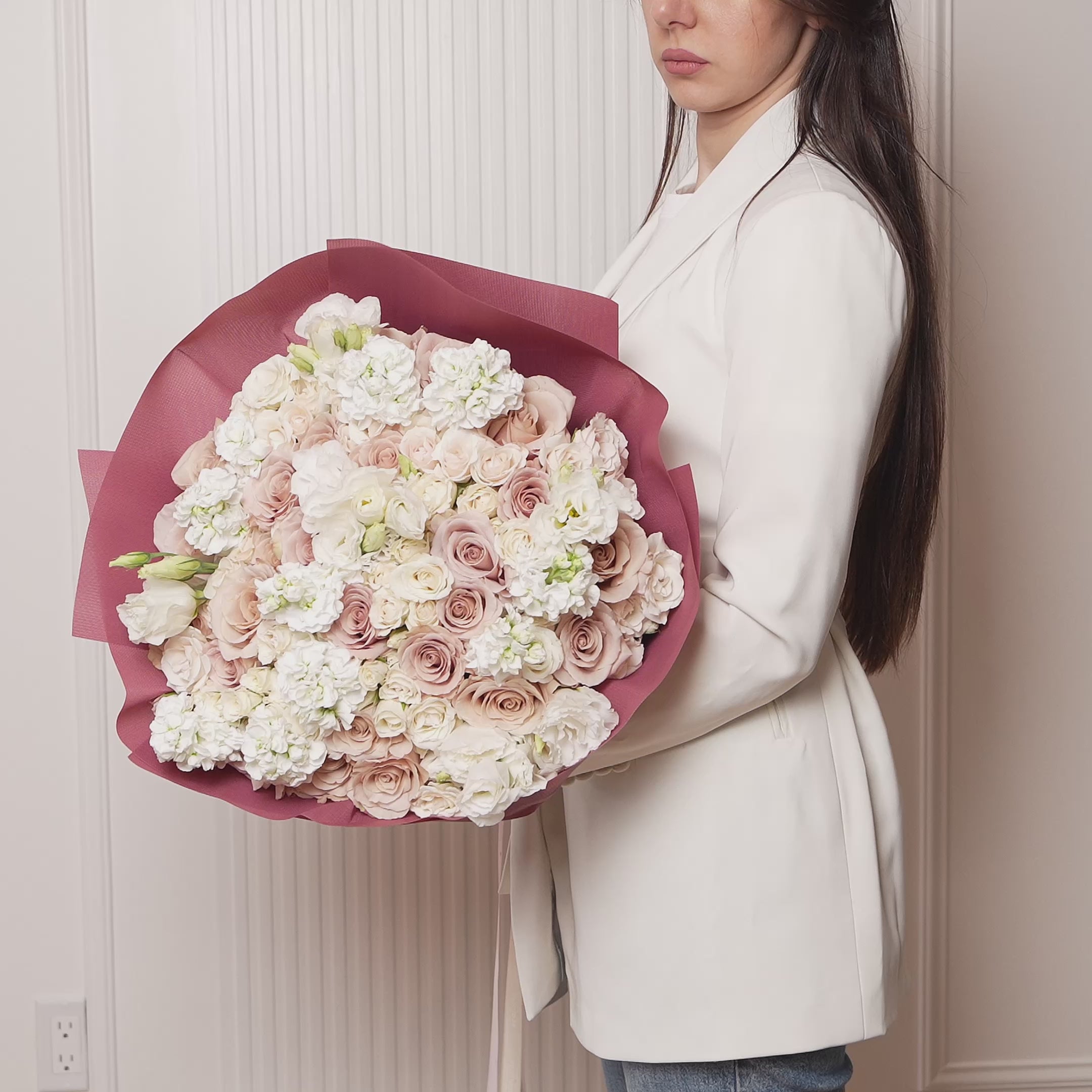 Understated yet unforgettable, Estelle is a whisper of elegance in creamy nudes and dusty blush tones. Featuring muted roses, ivory lisianthus, baby roses, and soft white stock, this bouquet sets the tone for timeless sophistication. It’s the perfect choice for refined hearts, modern romantics, and moments that call for quiet luxury.