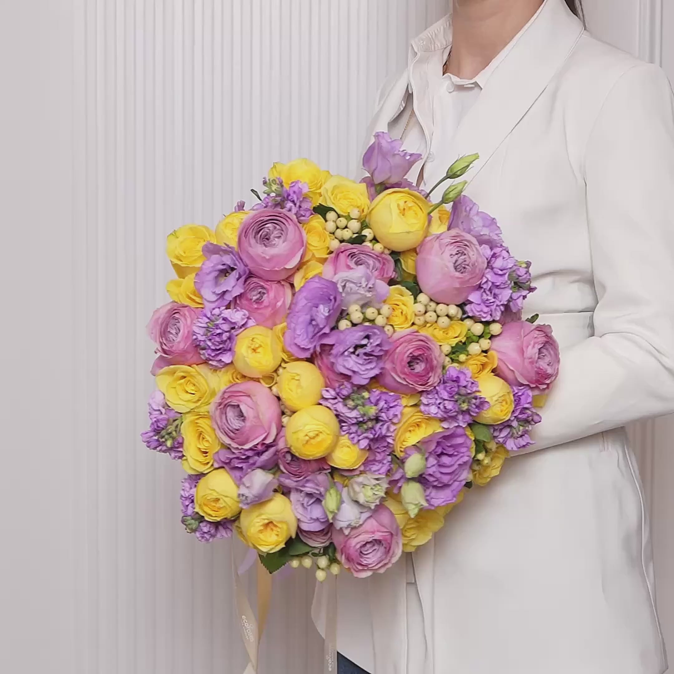 A radiant medley of yellow garden roses, pink garden roses, lavender lisianthus, fragrant stock, and soft white hypericum berries. “Aurora” captures the freshness of morning light and springtime joy—perfect for birthdays, new beginnings, or simply to brighten someone's day.