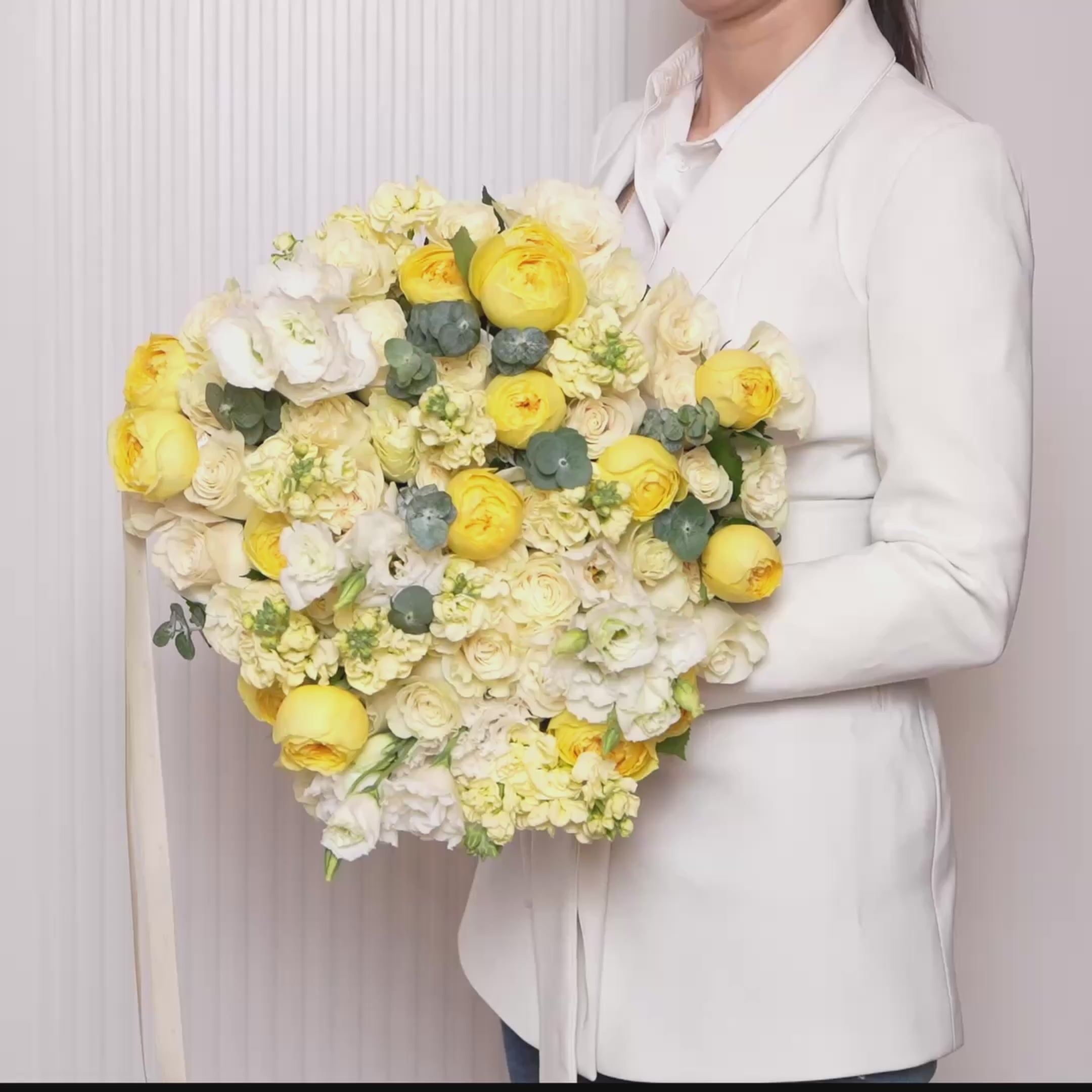 An elegant and refreshing bouquet composed of buttery yellow garden roses, creamy baby roses, white lisianthus, delicate stock, and eucalyptus. “Julia” evokes softness and sophistication—perfect for weddings, anniversaries, or refined everyday gestures.