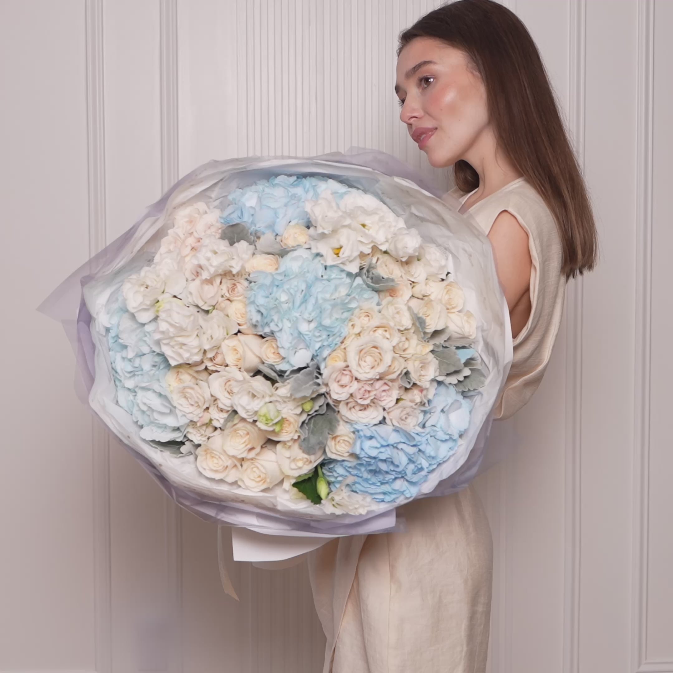Light as a cloud and serene as the morning sky, Celestia blends pale blush and ivory baby roses with sky-blue hydrangeas and creamy lisianthus, softened by silvery dusty miller. A bouquet that radiates calm elegance, perfect for weddings, new beginnings, or a gift that feels like a blessing.
