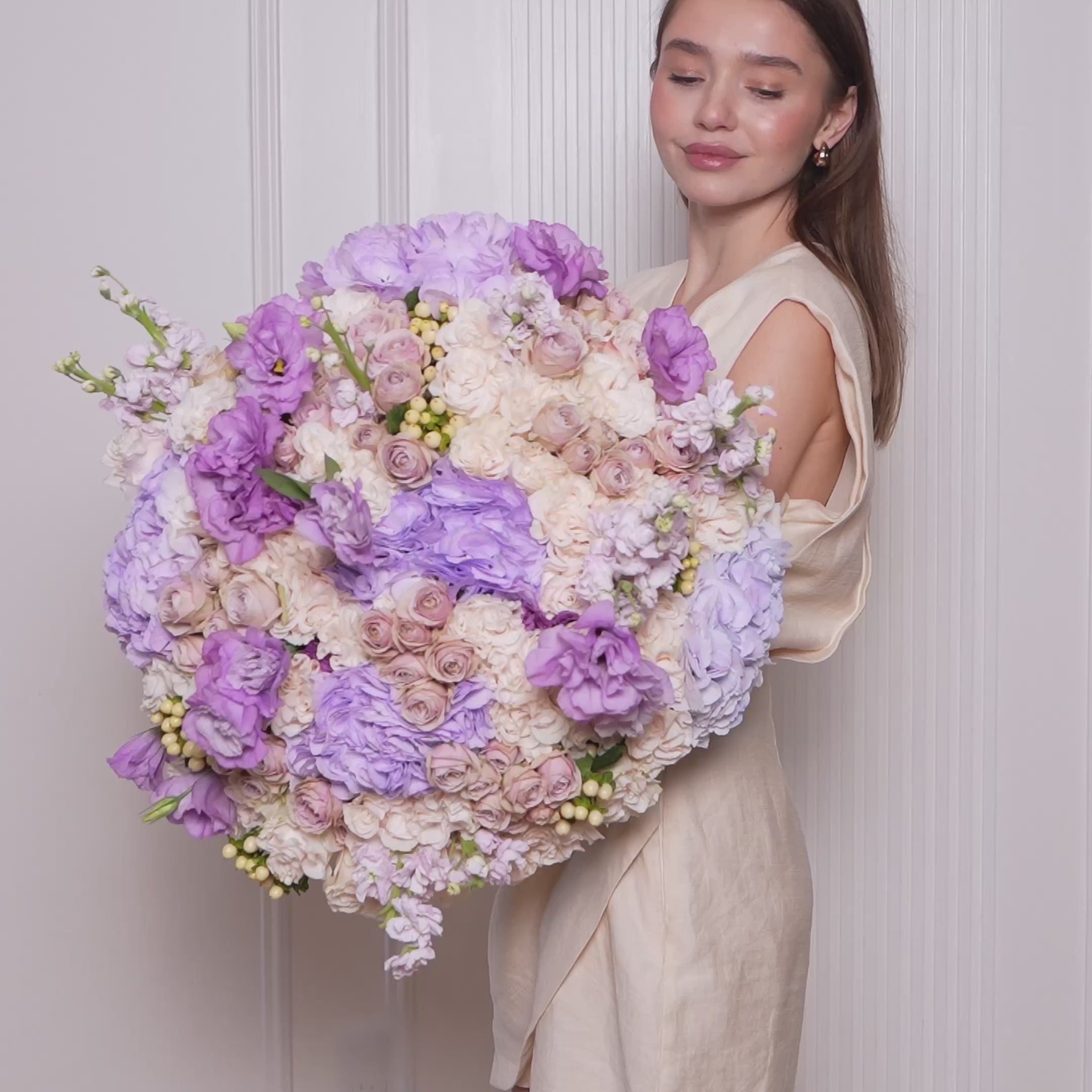 Graceful and enchanting, Madeleine is a dreamy cascade of lilac lisianthus, creamy roses, and soft hydrangeas, accented with golden hypericum for a touch of warmth. This bouquet feels like a romantic whisper—perfect for birthdays, heartfelt confessions, or moments meant to be remembered forever.