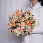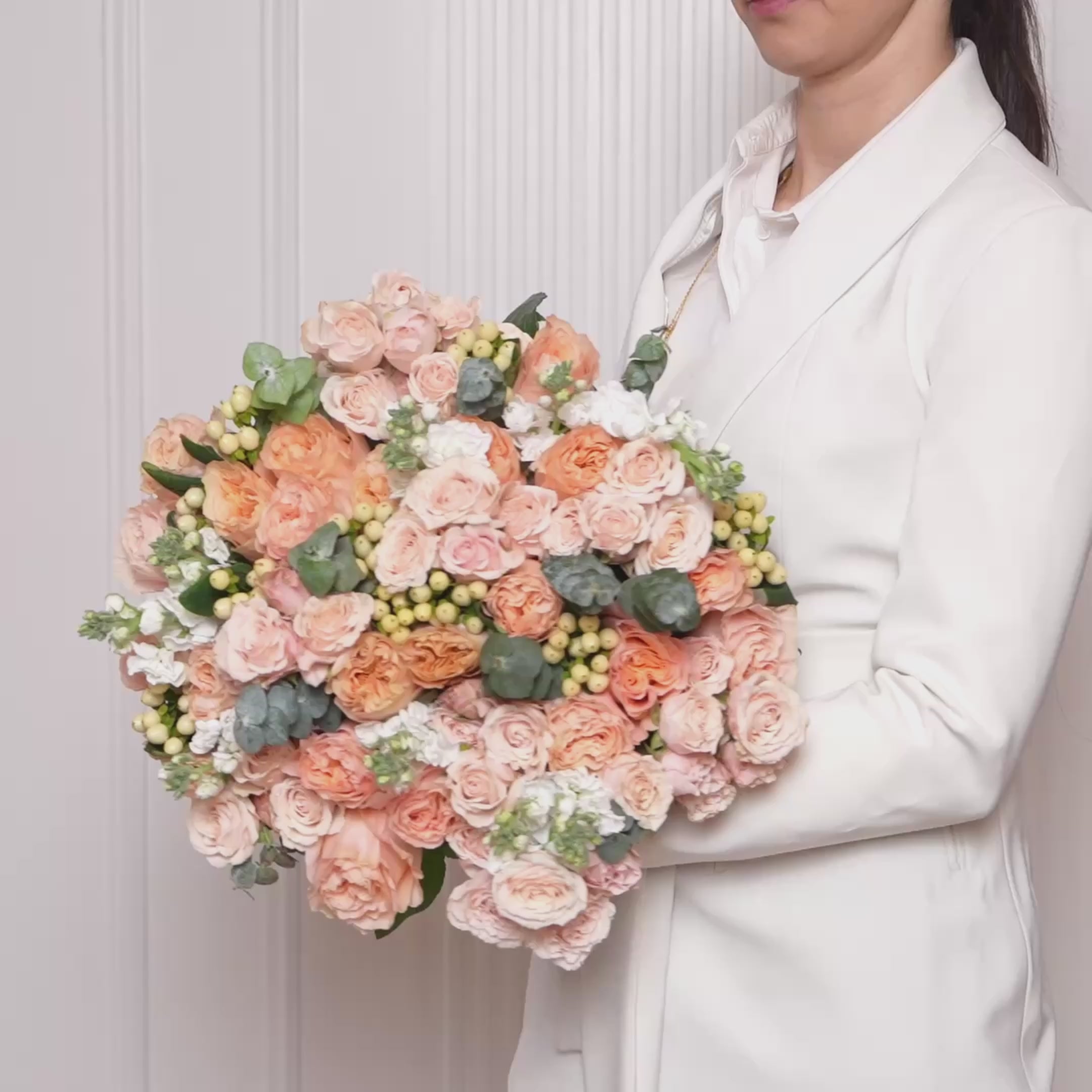 A refined blend of peach garden roses, soft baby roses, white stock, creamy hypericum berries, and eucalyptus. “Celeste” embodies warmth, charm, and grace—perfect for heartfelt gestures, bridal moments, or timeless décor.