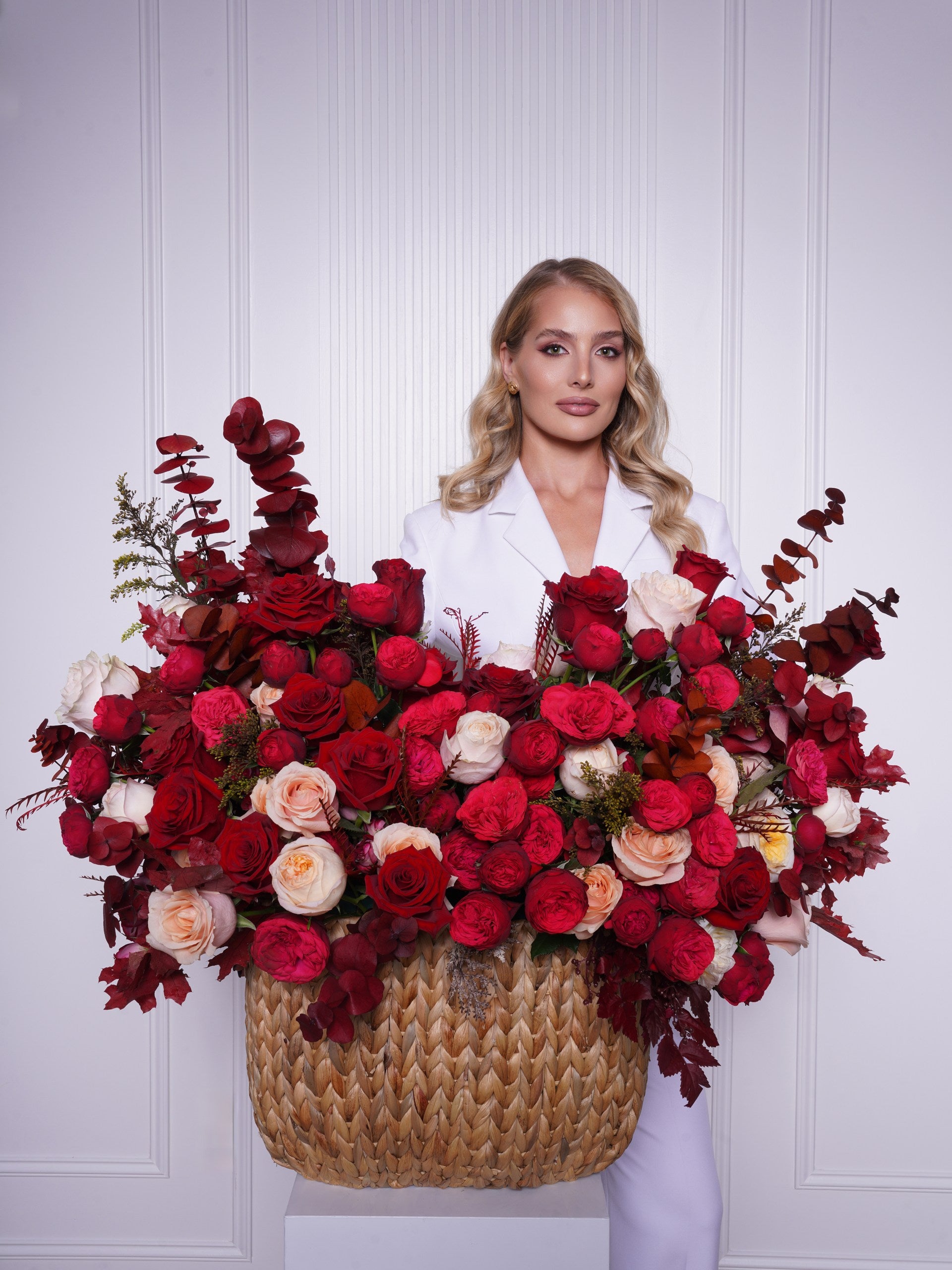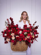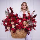 Silvana is a dramatic ode to passion and power. With rich layers of scarlet roses, fiery red ranunculus, and soft blush accents, this basket blooms like a flame against the dusk. Accented with burgundy eucalyptus and deep seasonal foliage, it’s the perfect statement for grand gestures, luxury events, or unforgettable love.