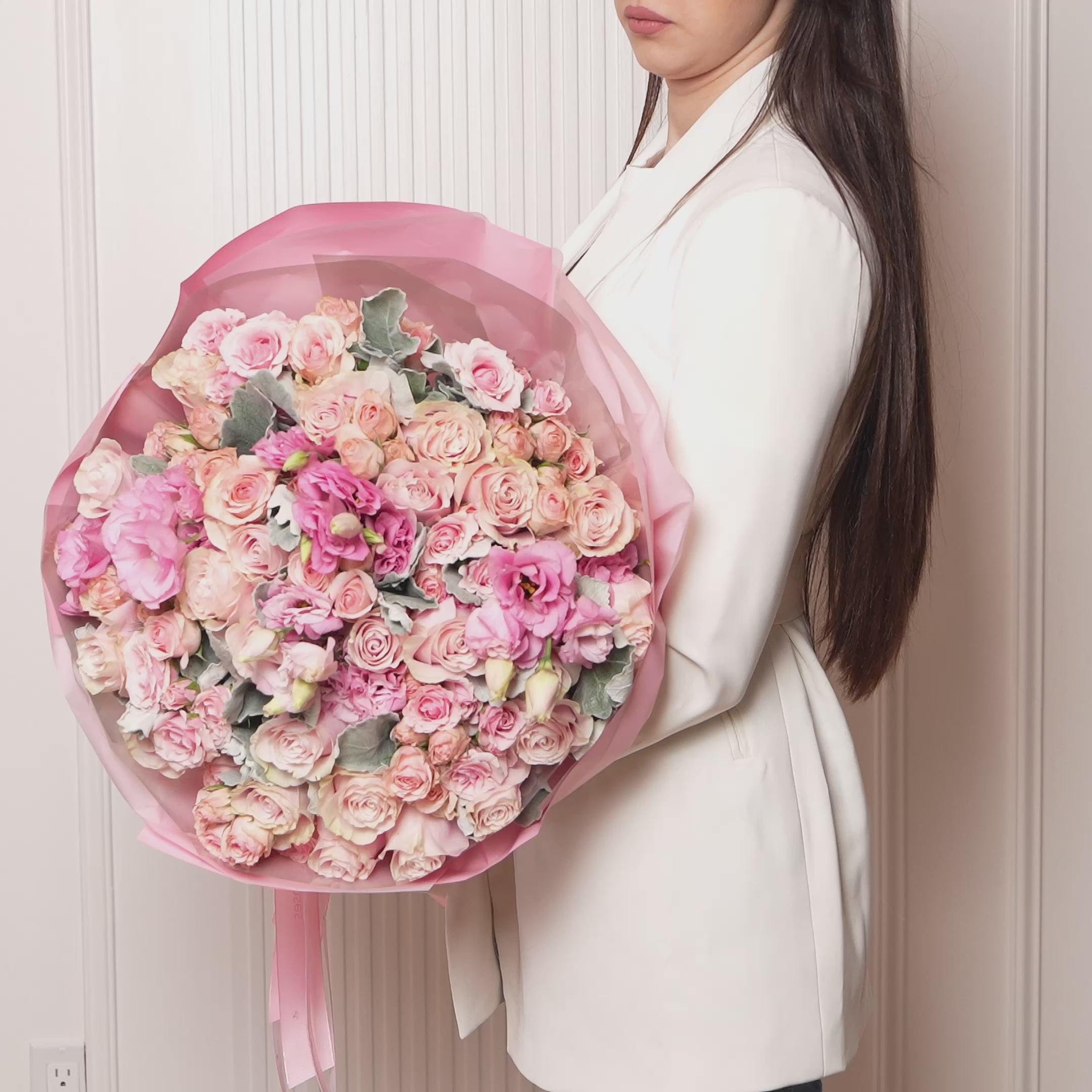 Chic, graceful, and effortlessly tender—Camille is a symphony of dusty pink roses, blush baby roses, lisianthus, and velvety dusty miller. Wrapped in soft blush tones, this bouquet feels like a quiet kiss on the cheek or a handwritten note you never throw away. Give it to leave a soft but lasting impression.