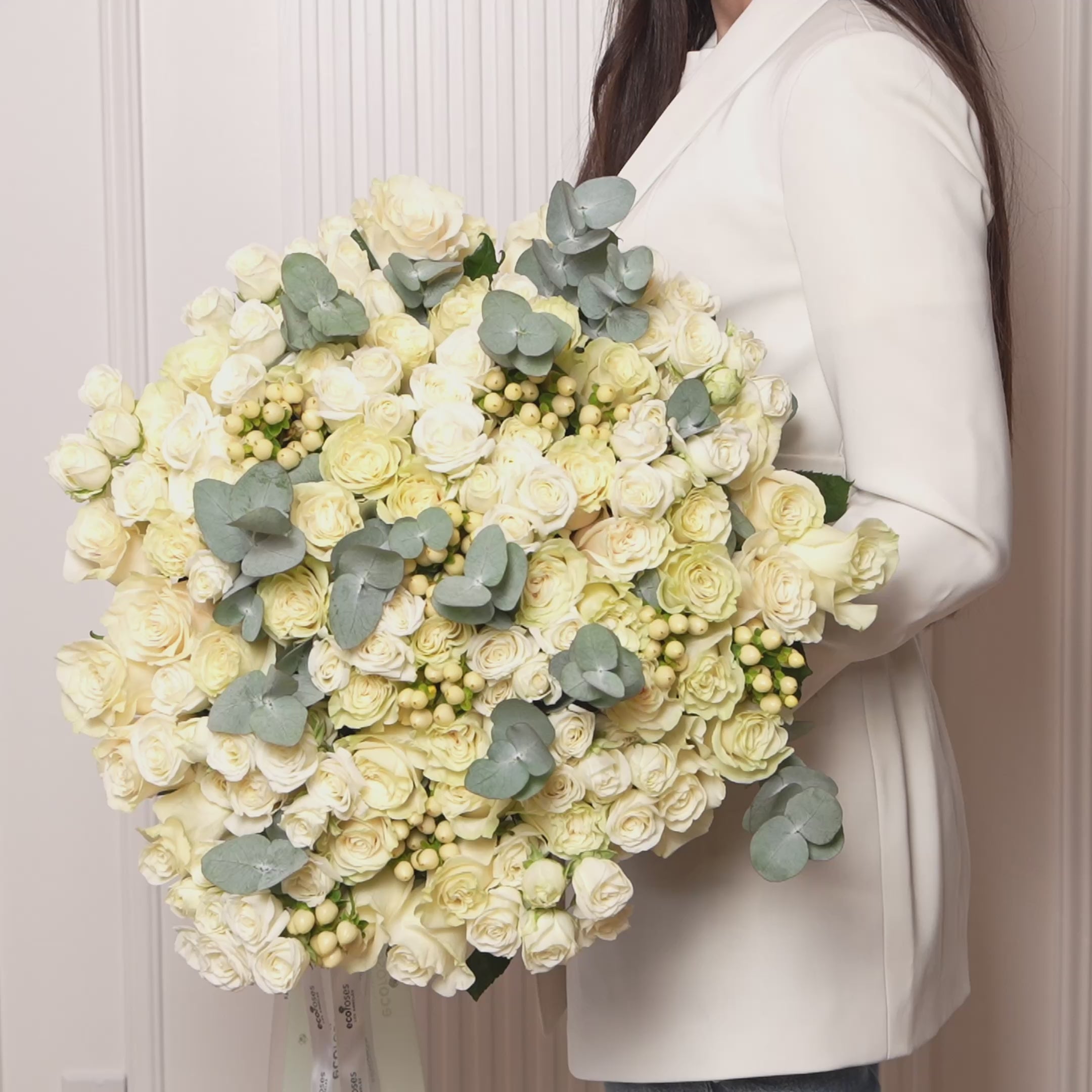 Effortlessly elegant and eternally fresh—Bianca is a vision of purity and poise. Featuring delicate ivory baby roses, soft lisianthus, creamy hypericum berries, and eucalyptus, this bouquet whispers calm sophistication. Perfect for new beginnings, heartfelt thanks, or celebrating timeless grace.